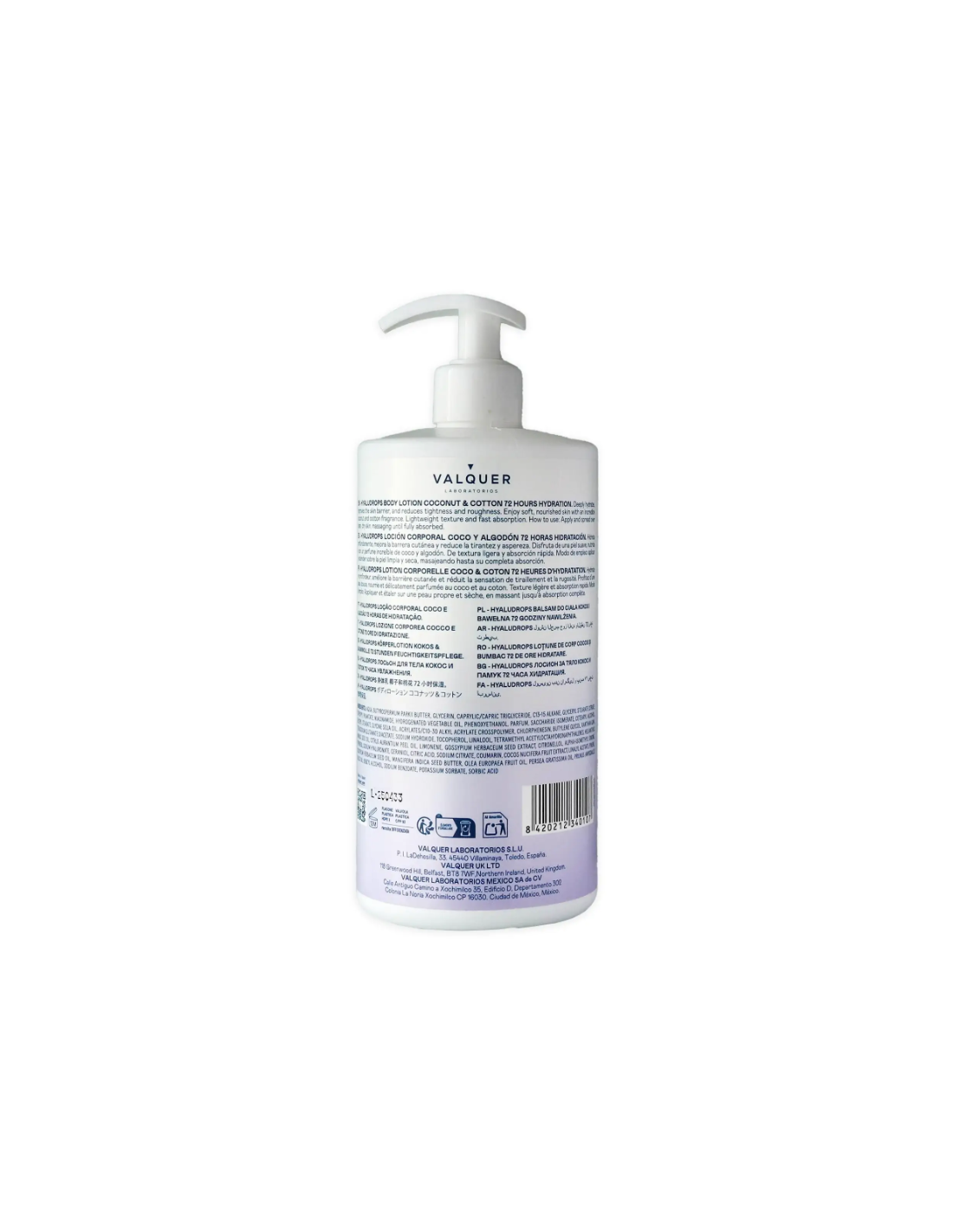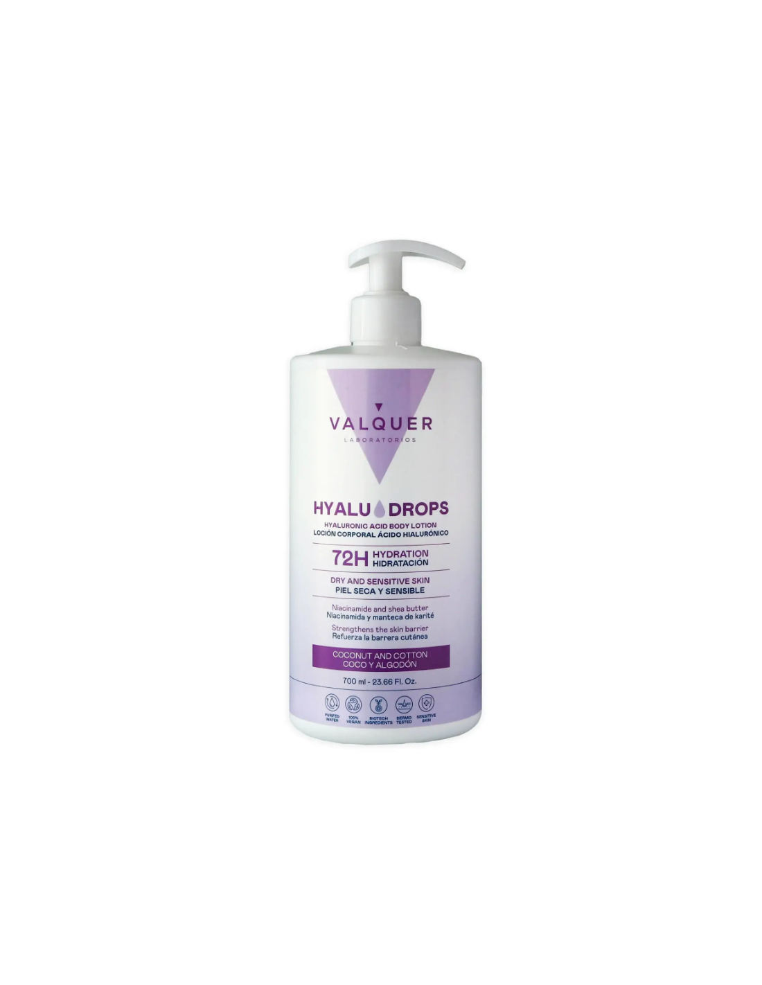 La Loción Corporal Hyaludrops Coco y Algodón 700 ml de Valquer es una fórmula avanzada diseñada para proporcionar una hidratación duradera hasta 72 horas frente a la sequedad. Su combinación de activos como ácido hialurónico, complejo de azúcares derivados del maíz y niacinamida ayudan a fortalecer la barrera cutánea, mejorar la elasticidad de la piel y devolver una textura más suave y confortable.