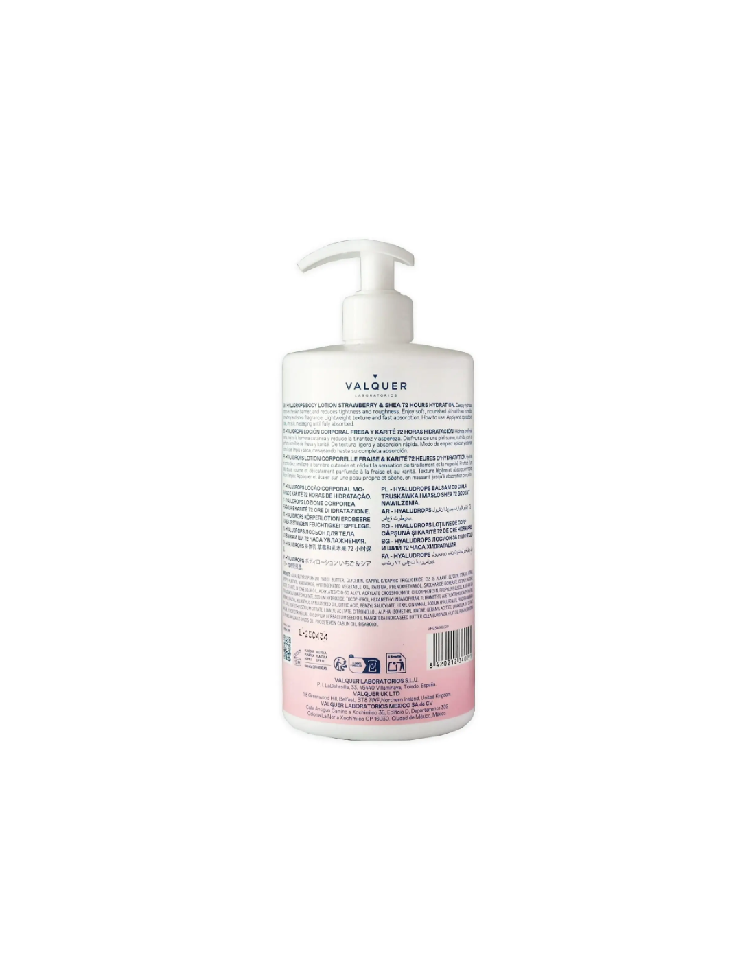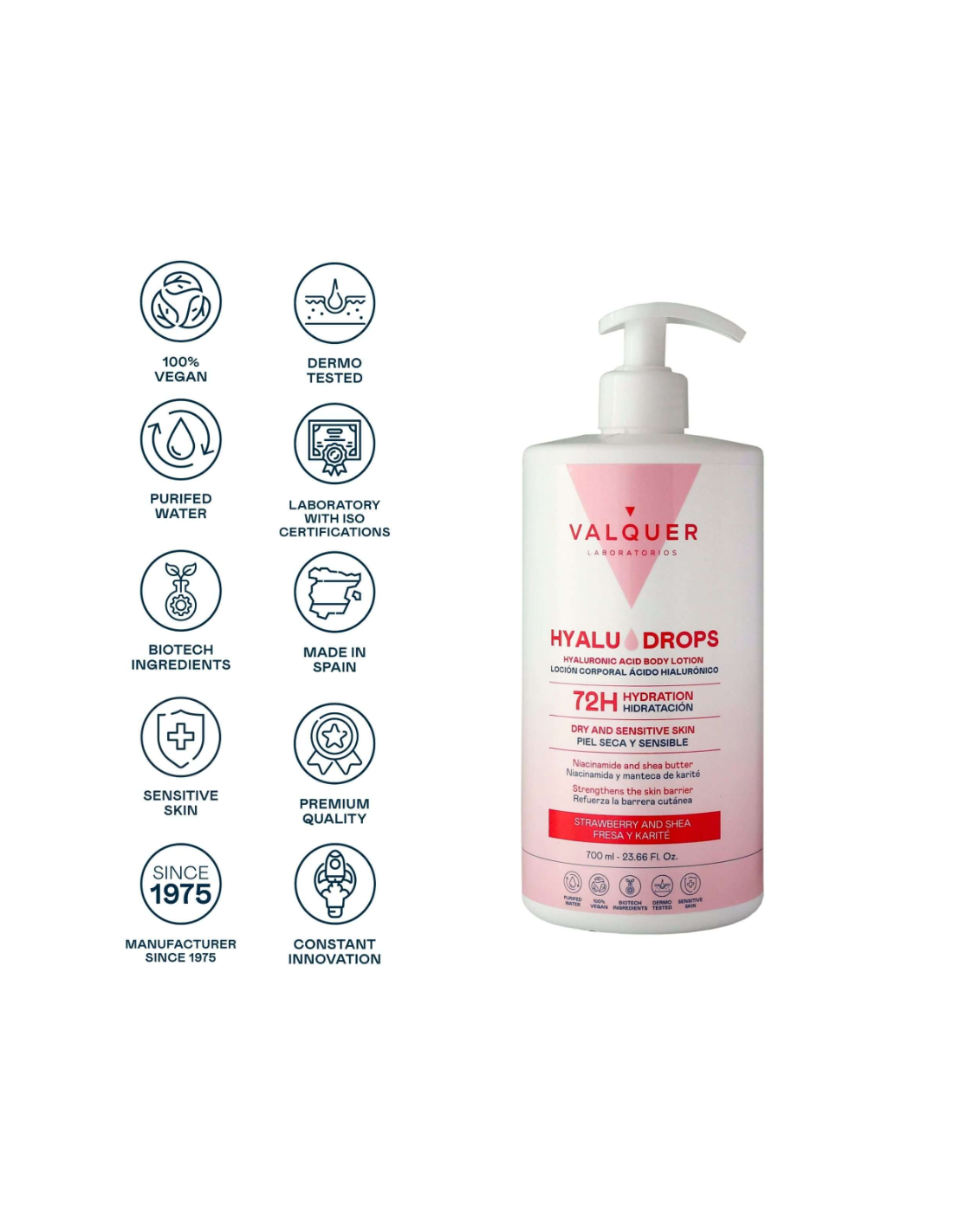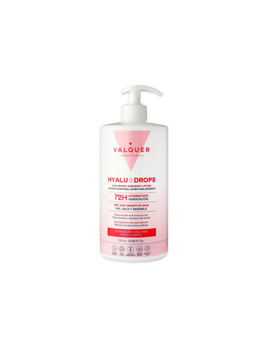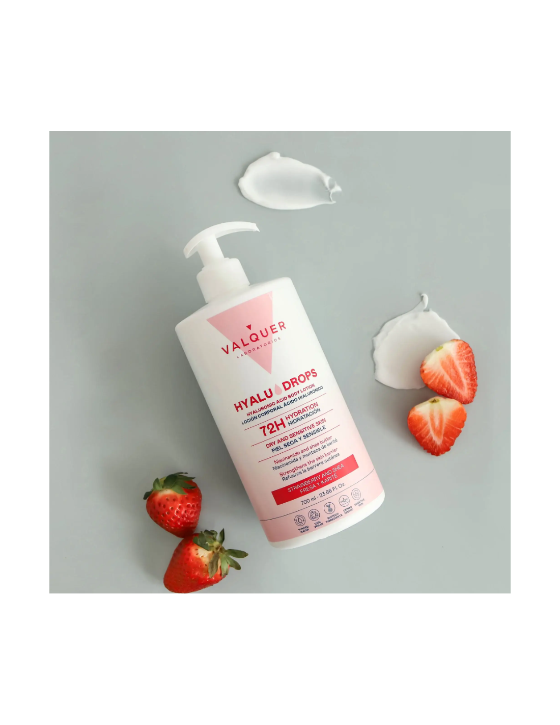 La Valquer Hyaludrops Loción Corporal Fresa y Karité 700 ml está especialmente formulada para proporcionar una hidratación profunda y duradera de hasta 72 horas, gracias a su combinación de activos como ácido hialurónico, niacinamida y manteca de karité.