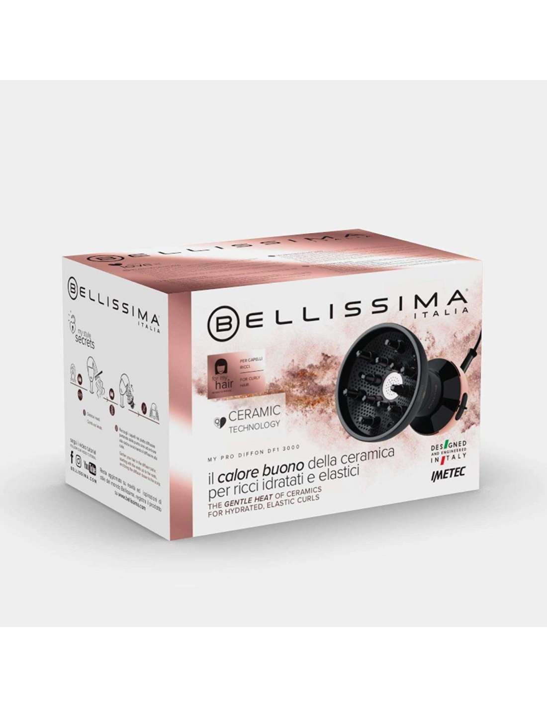 Para rizos consistentes y definidos, hidratados gracias al calor bueno de la cerámica. Bellissima Diffon DF1 3000 es el difusor de aire caliente que incluye difusor y secador de pelo en un único aparato proporcionando una acción antiencrespamiento y antisequedad. Perfecto para viajar.